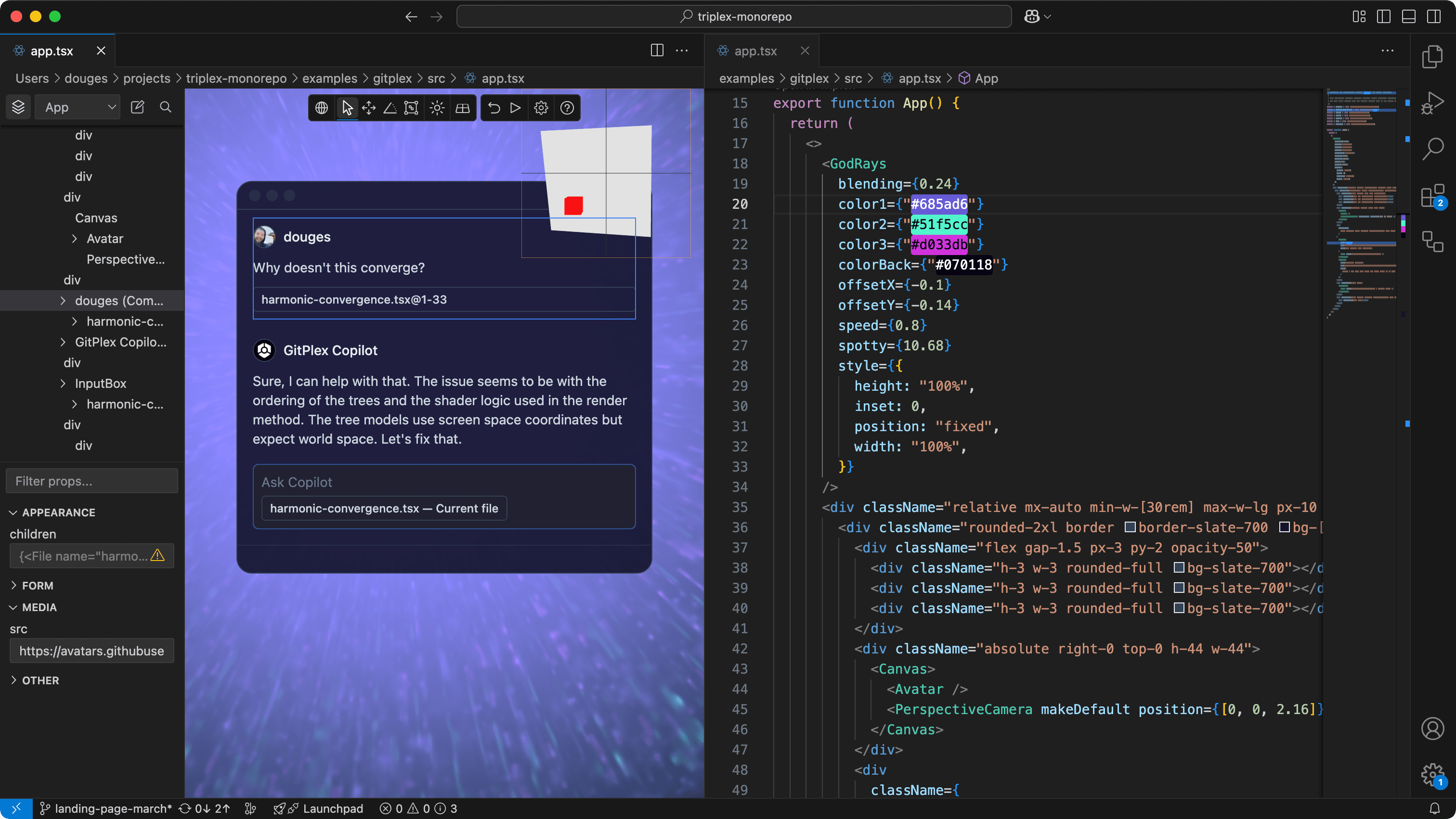 From landing pages, blogs, and even the next biggest social media site, build it with Triplex. Need another dimension? Bring in React Three Fiber and harmoniously build in 2D and 3D.
